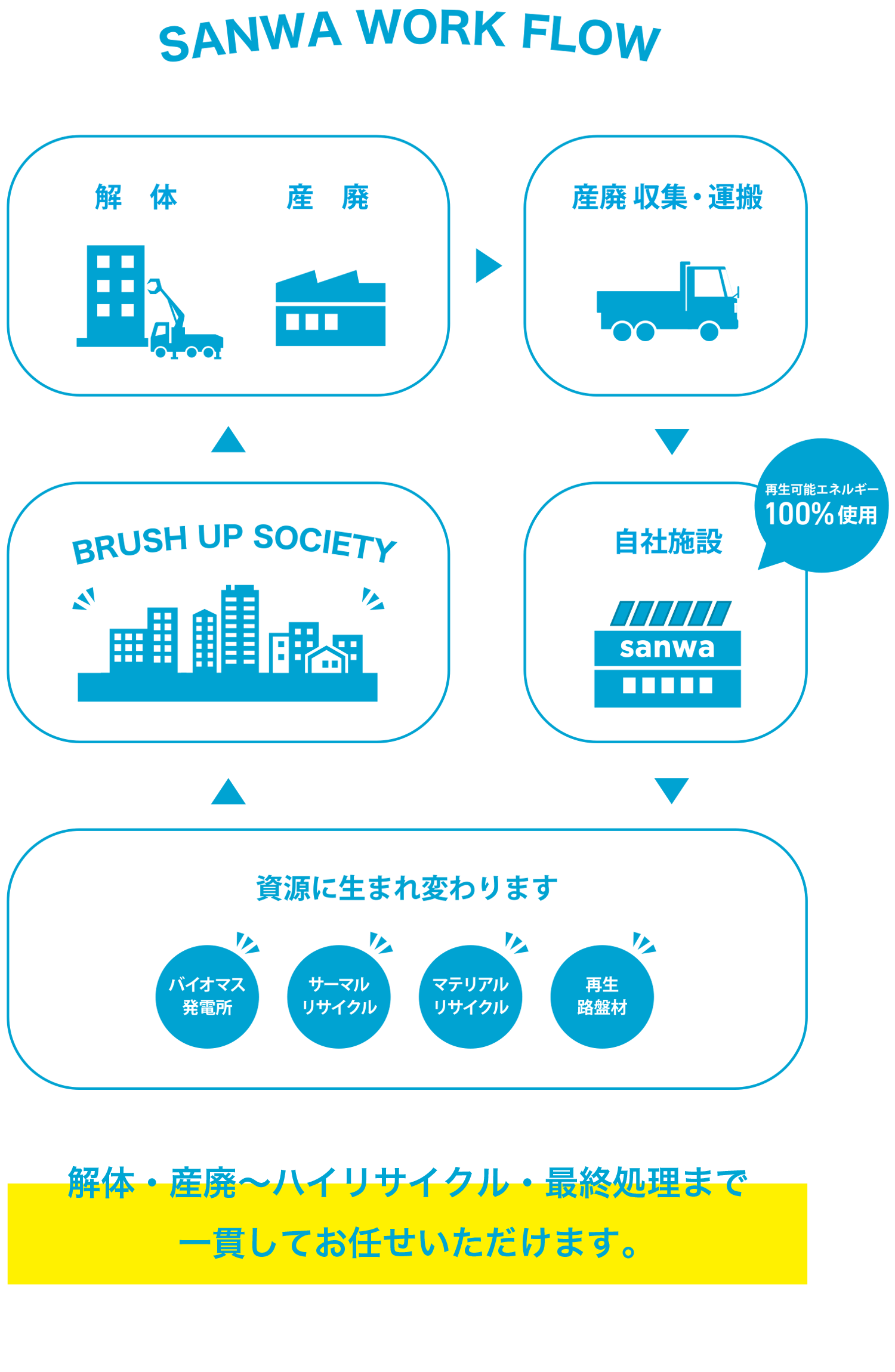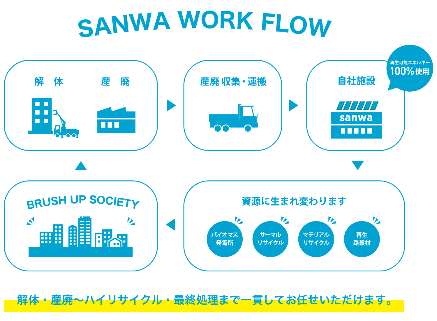 産業廃棄物処理(収集運搬・中間処理・最終処分)とリサイクル資材、土質改良材の生産と供給に取り組んでいます。