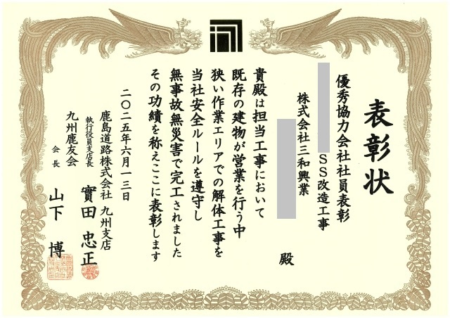 6月13日(金)、ホテルニューオータニ博多にて開催されました鹿島道路株式会社様の総会・安全大会におきまして、弊社社員が「優秀協力会社社員表彰」を賜りました。